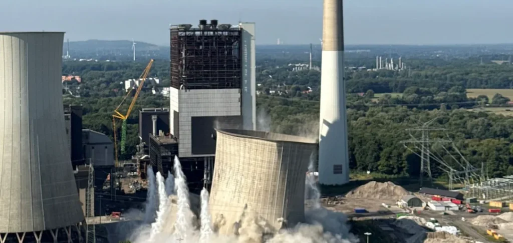 La société énergétique allemande Uniper a procédé à la démolition programmée de la tour de refroidissement F de 116 mètres sur son site de Scholven, situé à Gelsenkirchen. L’opération a été exécutée à 11h précises sous la supervision de la société Thüringer Sprenggesellschaft, spécialisée dans les explosifs, en présence d’invités triés sur le volet. Le processus s’inscrit dans le cadre du démantèlement de l’unité F, entamé en avril 2024.